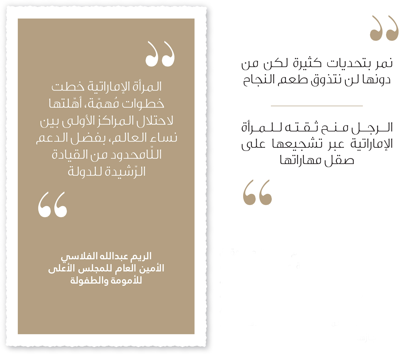 ولعل ما سهل الطريق أمام آل صالح لتحقيق طموحاتها كون المرأة الإماراتية عموماً «محظوظة لوجود قيادة تدعمها وتمكنها في المجتمع لتبدع فتدفعها إلى المزيد من النجاحات» على حد قولها وتضيف: «المرأة الإماراتية في المقابل قادرة على بلوغ كل الأهداف التي تطمح إليها إذا كان عندها الدافع والشغف لإنجازها».