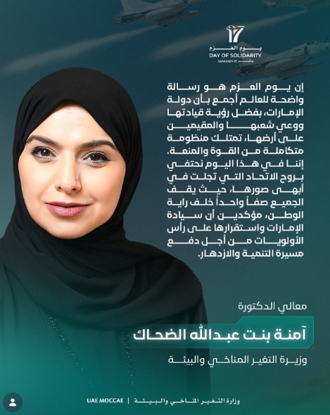 أكدت معالي الدكتورة آمنة بنت عبدالله الضحاك، وزيرة التغير المناخي والبيئة، أن الذكرى الرابعة لـ “يوم العزم”، تمثل مناسبة وطنية فارقة وشاهدة على قوة الإرادة الوطنية، وتجسد أسمى معاني التلاحم بين القيادة والشعب في مواجهة كافة التحديات....
