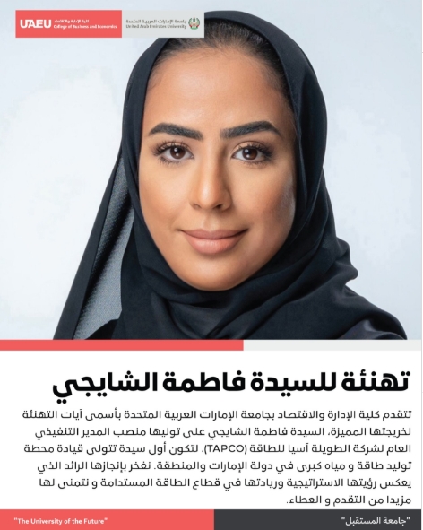 نبارك لخريجتنا المتميزة فاطمة الشايجي على توليها منصب المدير التنفيذي العام لشركة الطويلة آسيا للطاقة (TAPCO)، لتكون أول سيدة تقود محطة توليد طاقة ومياه كبرى في الدولة والمنطقة....