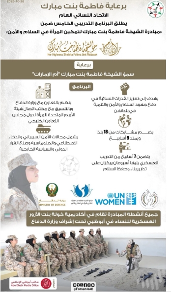 برعاية سموّ الشيخة #فاطمة_بنت_مبارك.. الاتحاد النسائي العام يطلق البرنامج التدريبي الخامس ضمن "مبادرة الشيخة فاطمة بنت مبارك لتمكين المرأة في السلام والأمن"، بالتعاون مع وزارة الدفاع، وبالتنسيق مع مكتب اتصال هيئة الأمم المتحدة للمرأة لدول مجلس التعاون الخليجي في #أبوظبي...