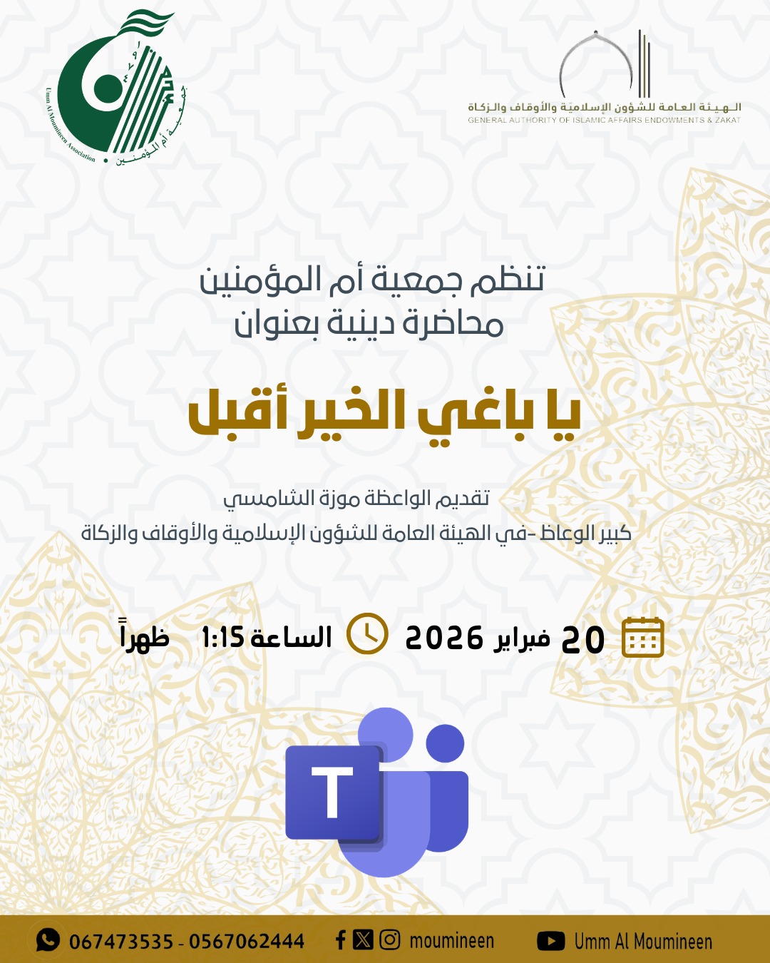 محاضرة " يا باغي الخير أقبل" محاضرة دينية قدمها الواعظة موزة الشامسي – من الهيئة العامة للشؤون الإسلامية والأوقاف والزكاة...