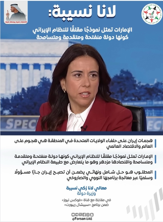 "الإمارات تمثل نموذجًا مقلقًا للنظام الإيراني كونها دولة منفتحة ومتقدمة ومتسامحة واقتصادها مزدهر وهو ما يتعارض مع طبيعة النظام الإيراني".. معالي لانا زكي نسيبة وزيرة دولة، في مقابلة مع قناة «فوكس نيوز» ضمن برنامج "سبيشال ريبورت"...
