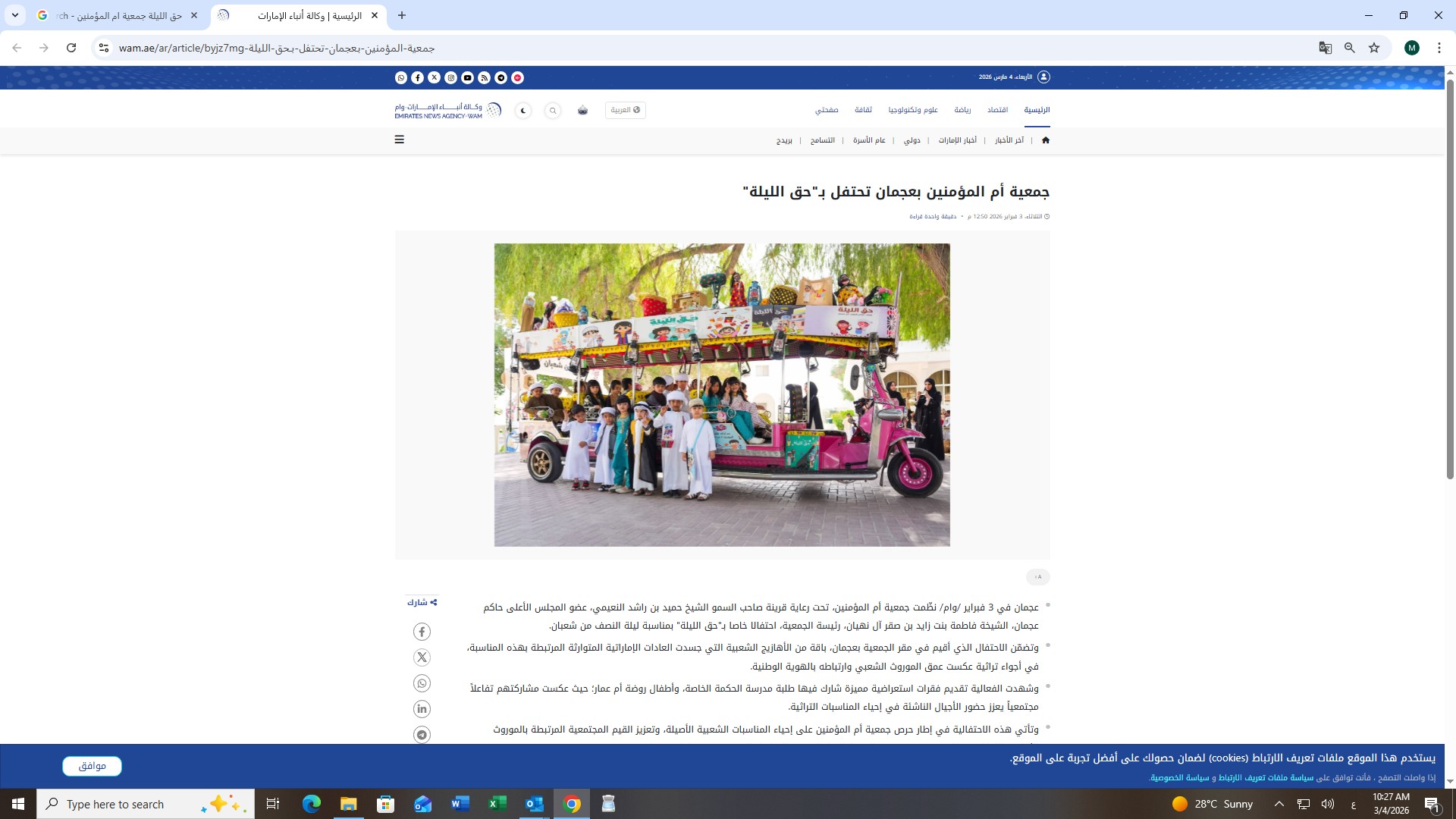 بمناسبة يوم الطفل الإماراتي ، شارك وفد جمعية أم المؤمنين والاتحاد النسائي العام بأبوظبي مع عدد من الأطفال في توزيع وجبات افطار صائم في الخيمة الرمضانية بإمارة عجمان وذلك بالتعاون مع هيئة الاعمال الخيرية العالمية بتاريخ 14/3/2026....