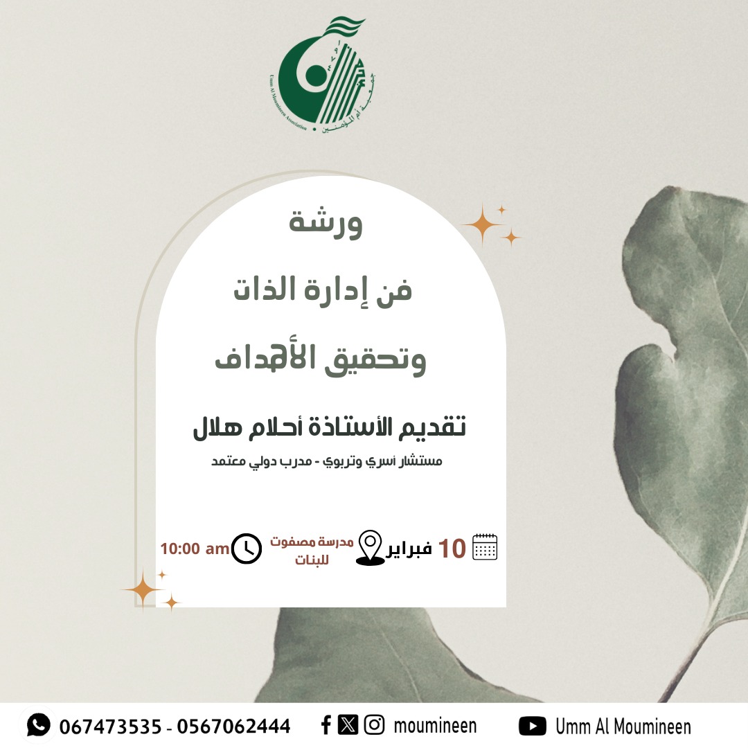 ورشة " فن إدارة الذات وتحقيق الأهداف " : تتحدث الورشة عن الذات مكوناتها وأنواعها وكيفية تهذيبها وادارتها خاصة في المرحلة الثانوية والاعدادية والتي هي بداية النضج وبناء الهوية والاستقلالية حتى تستطيع أن تحدد الهدف الذي تريد وتنطلق اليه...