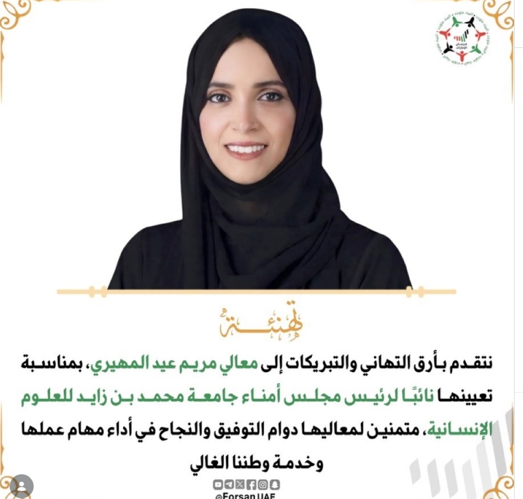 نتقدم بأرق التهاني والتبريكات إلى معالي #مريم_عيد_المهيري، بمناسبة تعيينها نائبًا لرئيس مجلس أمناء #جامعة_محمد_بن_زايد_للعلوم_الإنسانية، متمنين لمعاليها دوام التوفيق والنجاح في أداء مهام عملها وخدمة وطننا الغالي...