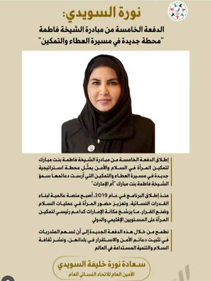 سعادة نورة خليفة السويدي، الأمين العام لـ الاتحاد_النسائي_العام إطلاق الدفعة الخامسة من مبادرة الشيخة فاطمة_بنت_مبارك لتمكين المرأة في السلام والأمن يمثِّل محطة استراتيجية جديدة في مسيرة العطاء والتمكين ...