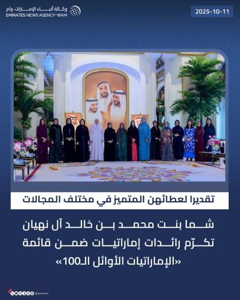 شما بنت محمد بن خالد آل نهيان تكرّم رائدات إماراتيات ضمن قائمة «الإماراتيات الأوائل الـ100...