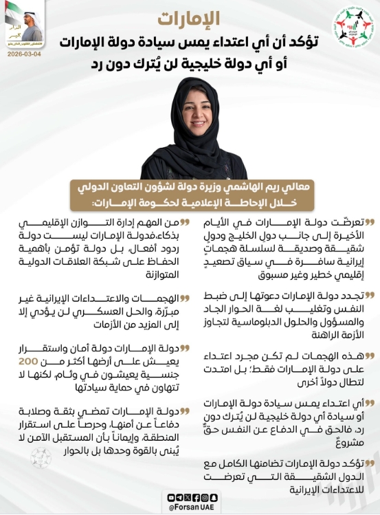 ”أي اعتداء يمس سيادة دولة الإمارات أو أي دولة خليجية لن يُترك دون رد”.. معالي ريم الهاشمي وزيرة دولة لشؤون التعاون الدولي، خلال الإحاطة الإعلامية لحكومة الإمارات: الإمارات دولة أمان واستقرار يعيش على أرضها أكثر من 200 جنسية يعيشون في وئام، الدولة تجدد دعوتها إلى ضبط النفس وتغليب لغة الحوار الجاد والمسؤول والحلول الدبلوماسية لتجاوز الأزمة الراهنة...