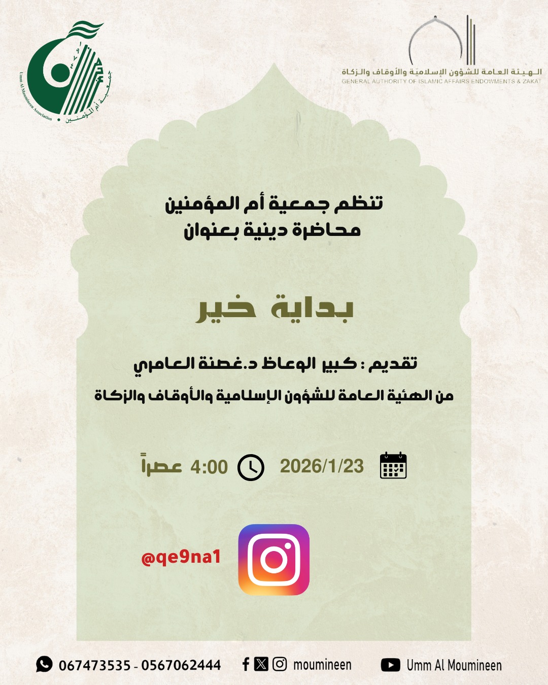 محاضرة دينية " بداية خير " قدمتها كبير الوعاظ د.غصنة العامري من الهيئة العامة للشؤون الإسلامية والأوقاف والزكاة بعجمان عن طريق البث المباشر عبر الانستجرام بتاريخ 23 يناير 2026...