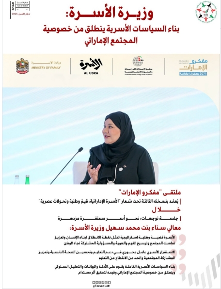 "الأسرة قضية وطنية استراتيجية تمثل نقطة الانطلاق لبناء الإنسان وتعزيز تماسك المجتمع وترسيخ القيم والهوية والمسؤولية المشتركة تجاه الوطن".. كلمة معالي سناء بنت محمد سهيل، #وزيرة_الأسرة، ضمن #ملتقى_مفكرو_الإمارات_2026...
