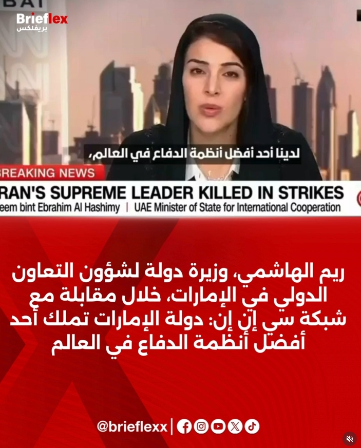 ريم الهاشمي، وزيرة دولة لشؤون التعاون الدولي في #الإمارات، خلال مقابلة مع شبكة سي إن إن: دولة الإمارات تملك أحد أفضل أنظمة الدفاع في العالم...