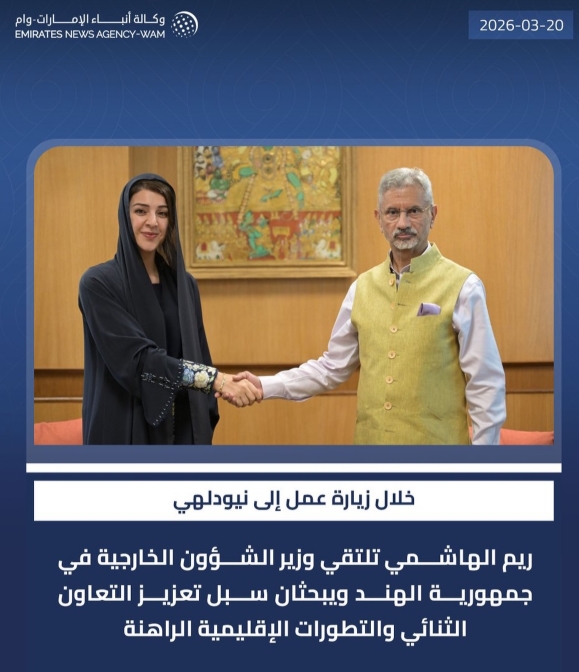 قامت معالي ريم بنت إبراهيم الهاشمي، وزيرة دولة لشؤون التعاون الدولي، بزيارة عمل إلى نيودلهي يوم الخميس 19 مارس 2026، التقت خلالها مع معالي الدكتور سوبرامانيام جايشانكار، وزير الشؤون الخارجية في جمهورية الهند، وسعادة فيكرام ميسري، وكيل وزارة الشؤون الخارجية....