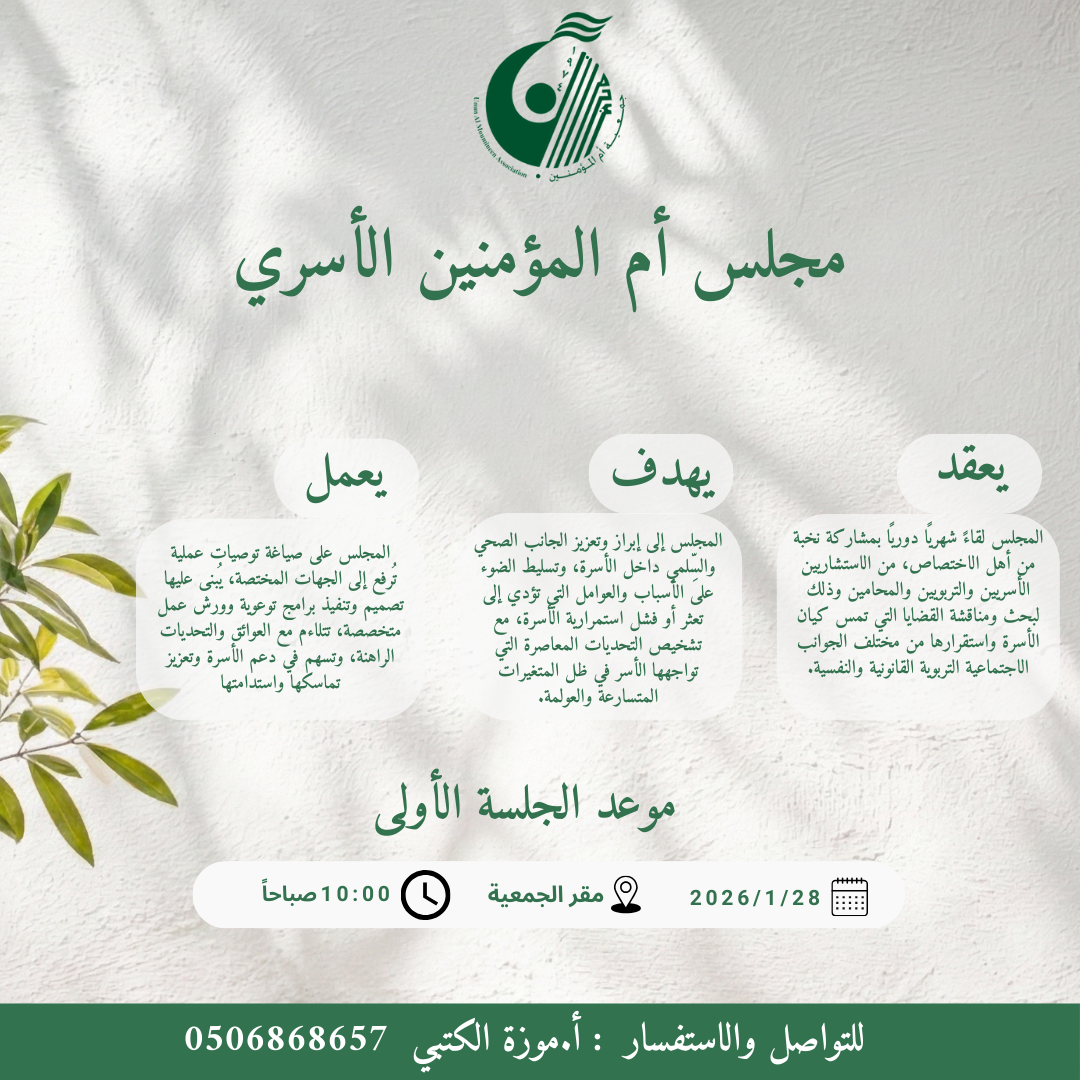 جلسة " كيف نجعل الأسرة أثر سعادة واستقراراً ؟ أدارت الجلسة الاستاذة نجيبة الرفاعي مع نخبة من أهل الاختصاص من الاستشاريين الأسريين والتربويين والمحامين ،وذلك لبحث ومناقشة القضايا التي تمس كيان الأسرة واستقرارها ، بمقر الجمعية بتاريخ 28/ يناير 2026....