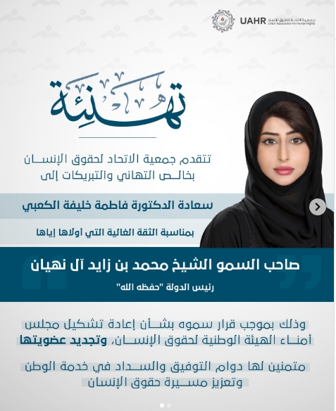 تتقدم جمعية الاتحاد لحقوق الإنسان بأسمى آيات التهاني والتبريكات إلى سعادة الدكتورة فاطمة خليفة الكعبي، على الثقة الغالية التي أولاها إياها صاحب السمو الشيخ محمد بن زايد آل نهيان، رئيس الدولة "حفظه الله"، ...