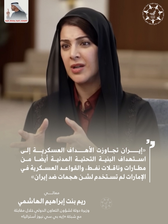ريم الهاشمي، وزيرة دولة لشؤون التعاون الدولي: #إيران تستهدف البنية التحتية المدنية...