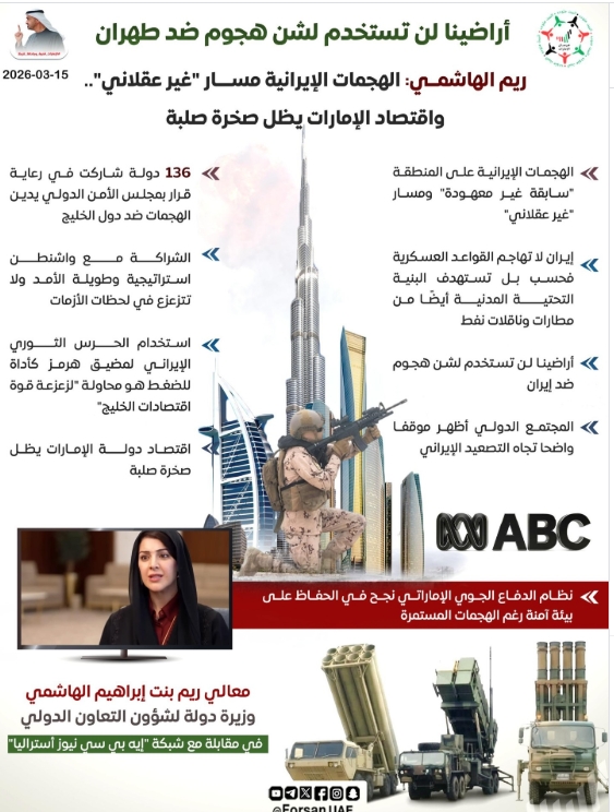 "إيران تجاوزت الأهداف العسكرية إلى استهداف البنية التحتية المدنية أيضًا من مطارات وناقلات نفط، والقواعد العسكرية في الإمارات لم تستخدم لشن هجمات ضد إيران"...