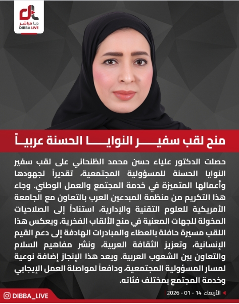 حصلت الدكتور علياء حسن محمد الظنحاني على لقب سفير النوايا الحسنة للمسؤولية المجتمعية، تقديراً لجهودها وأعمالها المتميزة في خدمة المجتمع والعمل الوطني. وجاء هذا التكريم من منظمة المبدعين العرب بالتعاون مع الجامعة الأمريكية للعلوم التقنية والإدارية، استناداً إلى الصلاحيات المخولة للجهات المعنية في منح الألقاب الفخرية. ويعكس هذا اللقب مسيرة حافلة بالع...