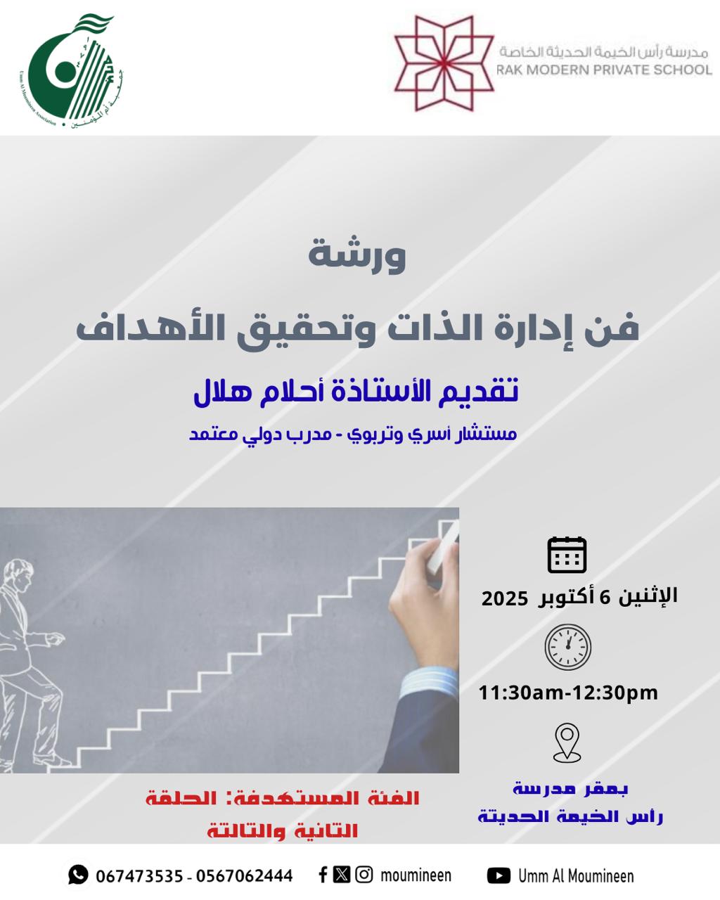 ورشة " فن إدارة الذات وتحقيق الأهداف" قدمتها أ.أحلام هلال – مستشار أسري وتربوي ومدرب دولي معتمد ، لطالبات مدرسة رأس الخيمة الحديثة بتاريخ 6 أكتوبر 2025 بمقر مدرسة رأس الخيمة الحديثة برأس الخيمة. ...