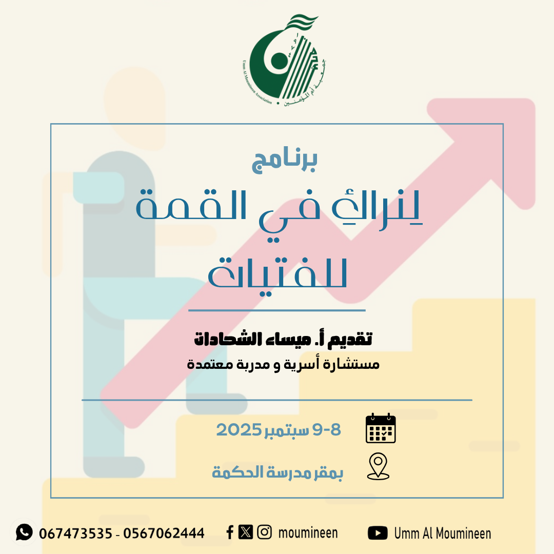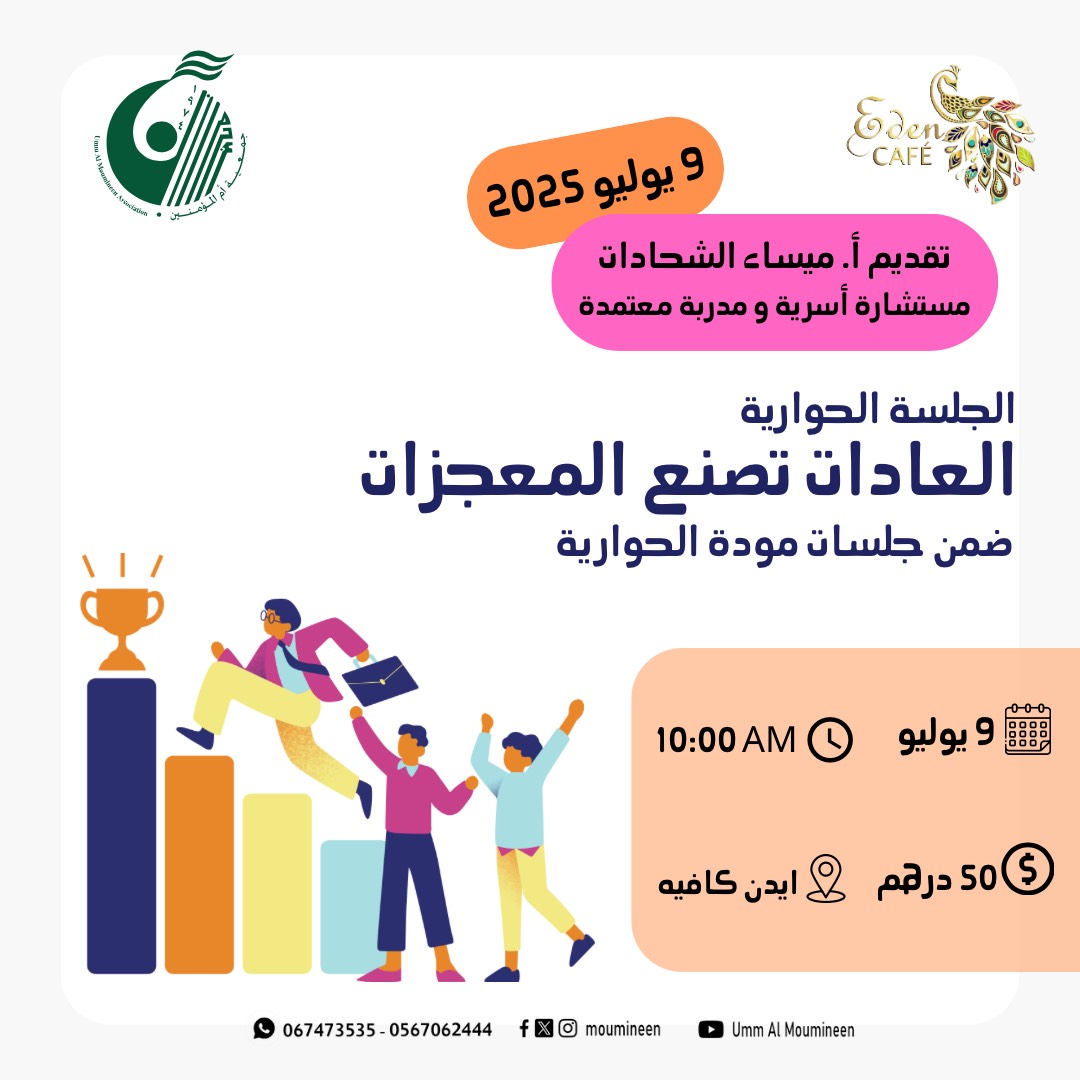 الجلسة الحوارية " العادات تصنع المعجزات" جلسة ضمن برنامج جلسات مودة الحوارية، قدمتها أ.ميساء الشحادات مستشارة أسرية ومدربة معتمدة في أيدين كافية – عجمان بتاريخ 9 يوليو2025م...