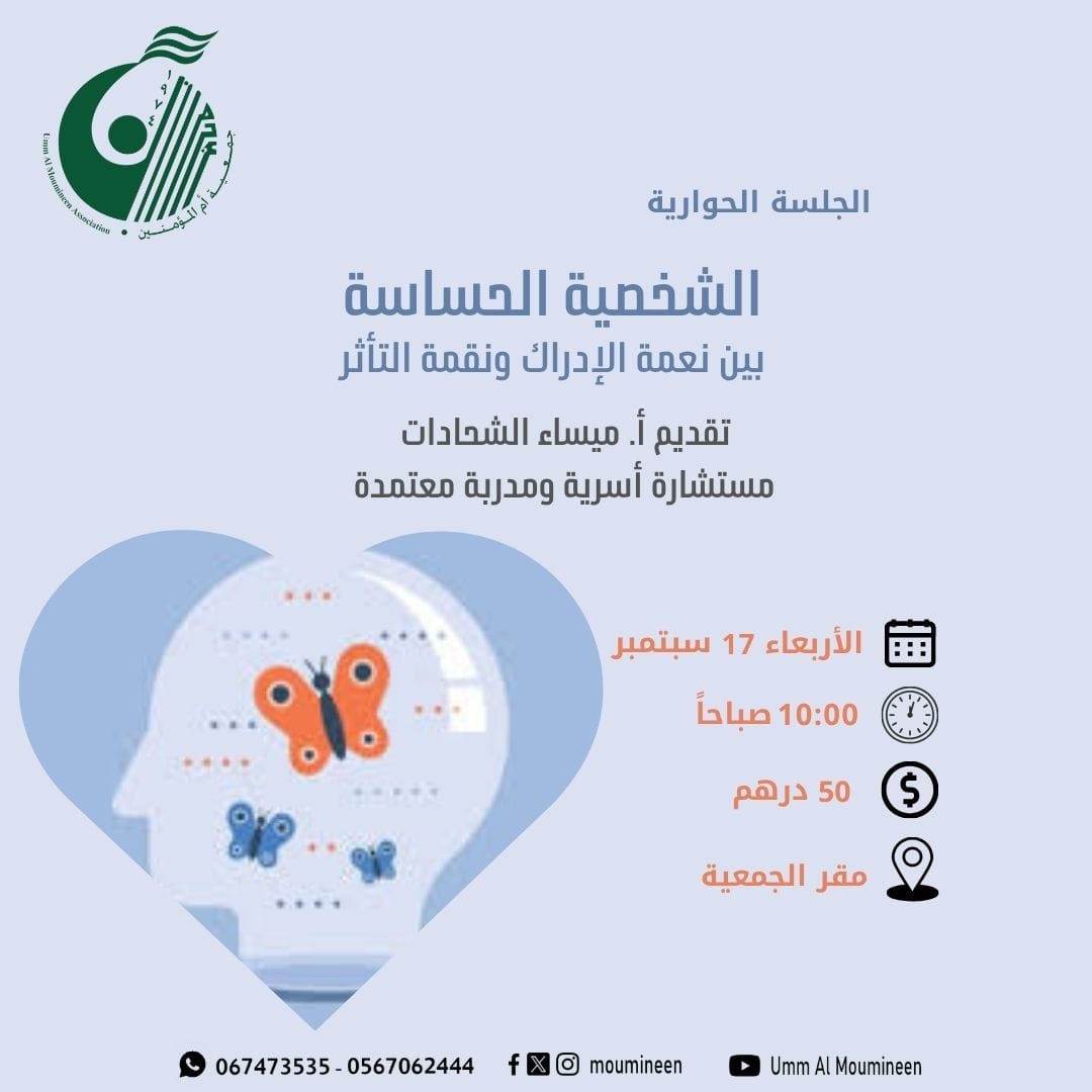 الجلسة الحوارية " الشخصية الحساسة بين نعمة الادراك ونقمة التأثر" جلسة ضمن برنامج جلسات مودة الحوارية، قدمتها أ.ميساء الشحادات مستشارة أسرية ومدربة معتمدة في مقر الجمعية – عجمان بتاريخ 17 سبتمبر 2025....