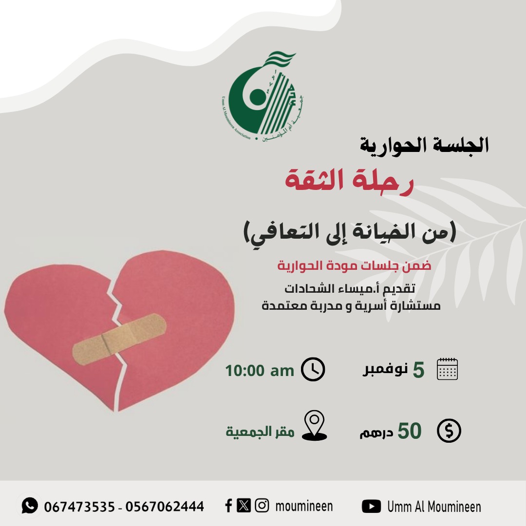 الجلسة الحوارية " رحلة الثقة من الخيانة الى التعافي" جلسة ضمن برنامج جلسات مودة الحوارية، قدمتها أ.ميساء الشحادات مستشارة أسرية ومدربة معتمدة في مقر الجمعية – عجمان بتاريخ 5 نوفمبر 2025....