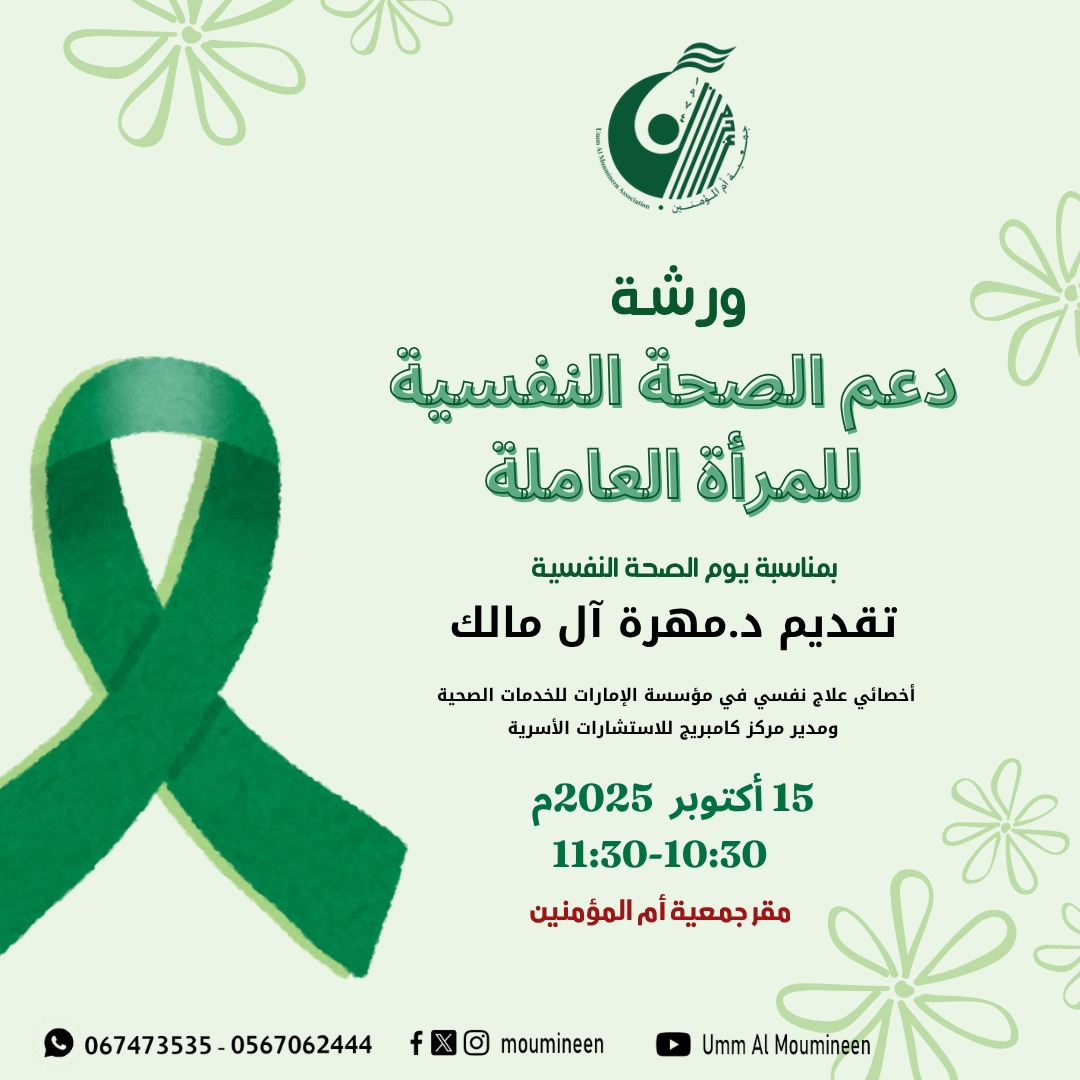 ورشة " دعم الصحة النفسية للمرأة العاملة " قدمتها د.مهرة آل مالك – أخصائي علاج نفسي بمناسبة اليوم العالمي للصحة النفسية بتاريخ 15 اكتوبر 2025 ، بمقر الجمعية....