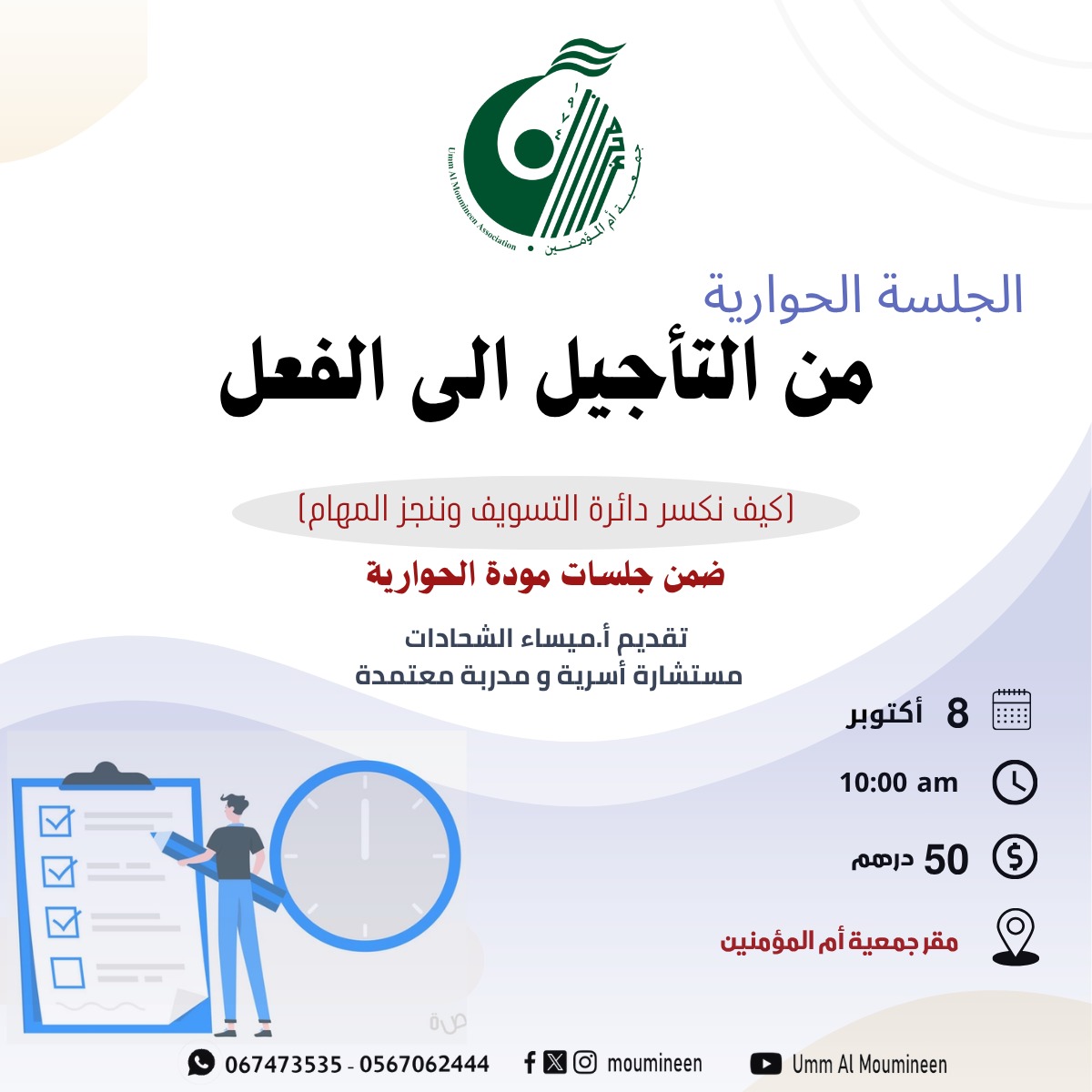 الجلسة الحوارية " من التأجيل الى الفعل" جلسة ضمن برنامج جلسات مودة الحوارية، قدمتها أ.ميساء الشحادات مستشارة أسرية ومدربة معتمدة في مقر الجمعية – عجمان بتاريخ 8 أكتوبر2025 ...