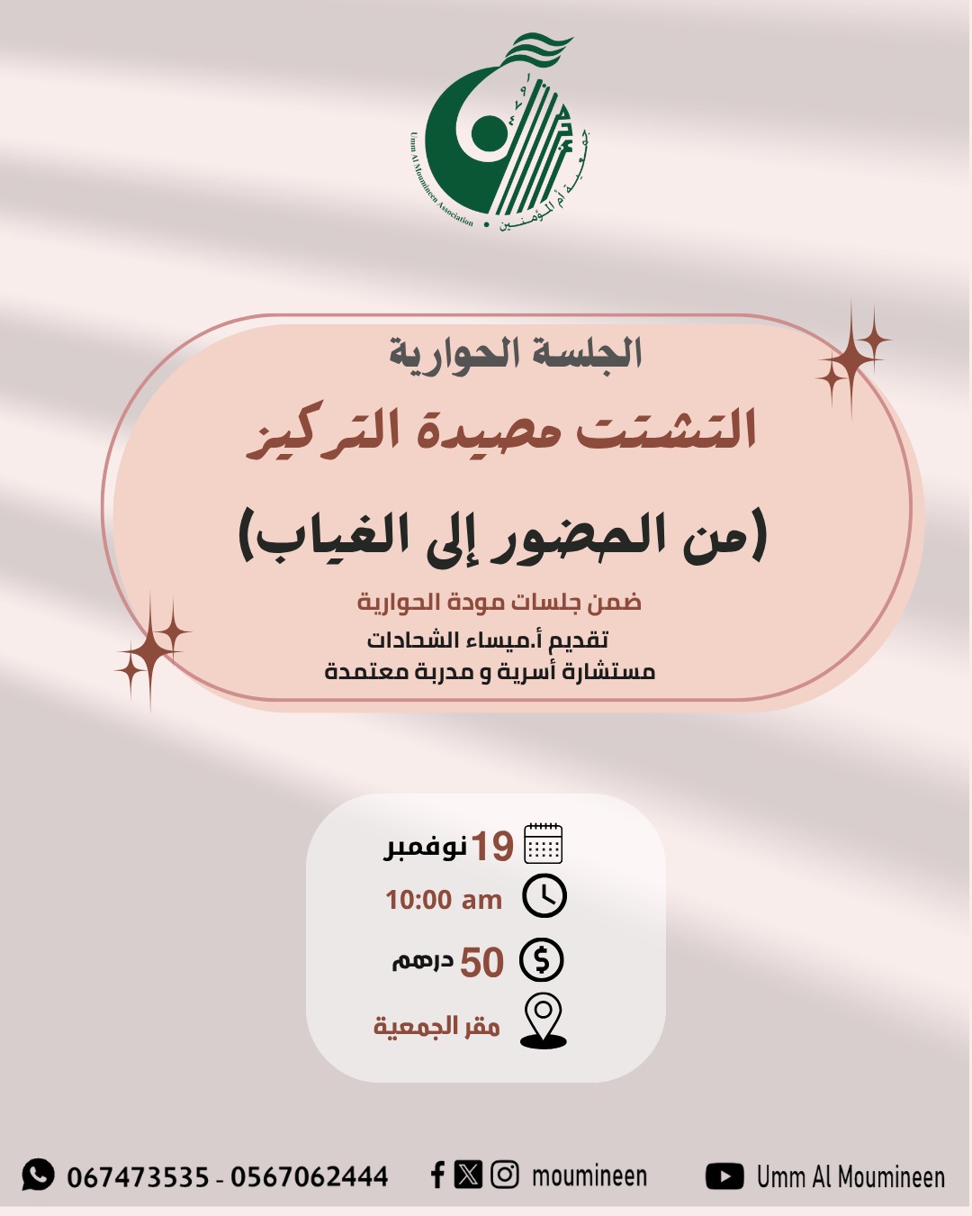 الجلسة الحوارية مصيدة التشتت التركيز (من الحضور الى الغياب) جلسة ضمن برنامج جلسات مودة الحوارية، قدمتها أ.ميساء الشحادات مستشارة أسرية ومدربة معتمدة في مقر الجمعية – عجمان بتاريخ 19 نوفمبر 2025....