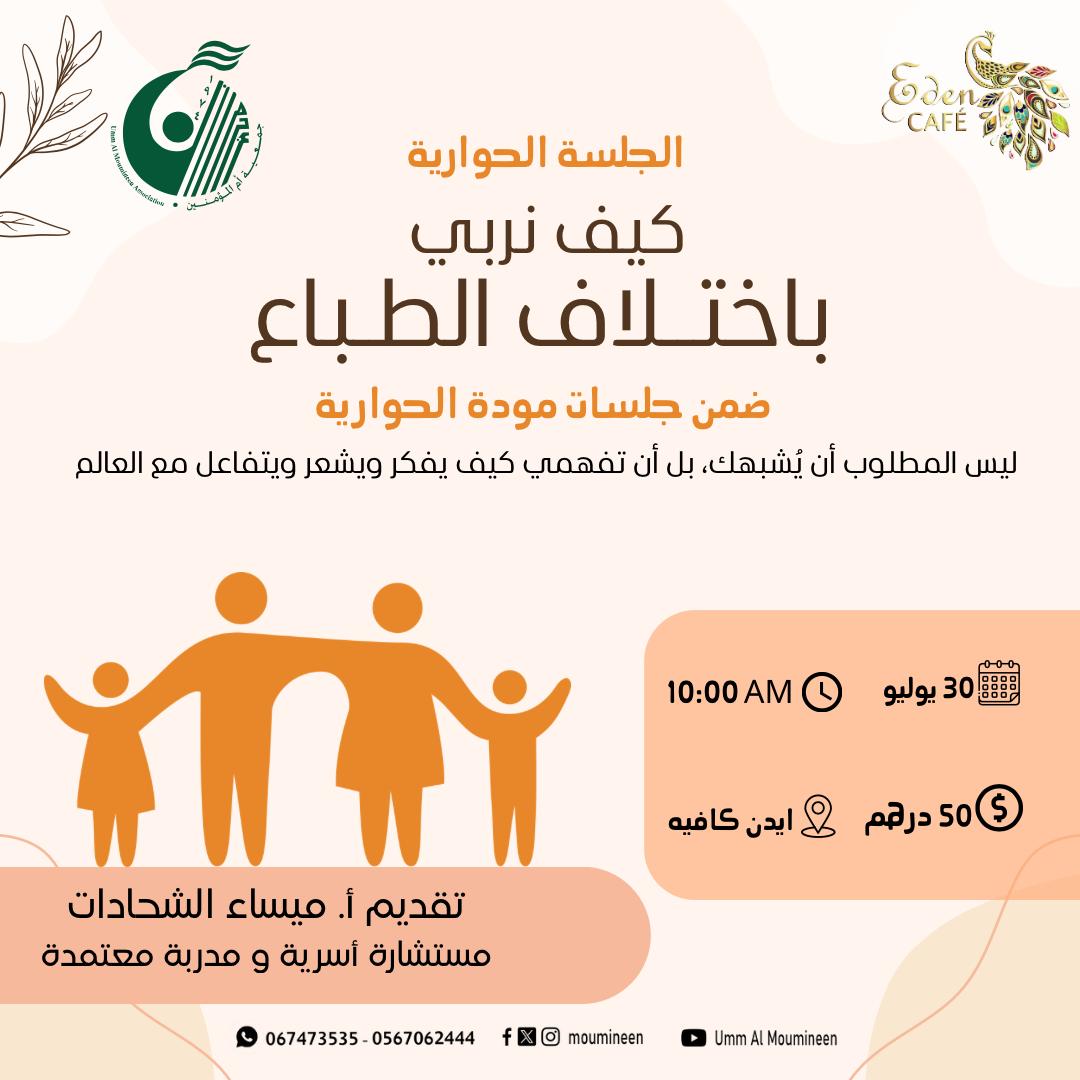 الجلسة الحوارية " كيف نربي باختلاف الطباع" جلسة ضمن برنامج جلسات مودة الحوارية، قدمتها أ.ميساء الشحادات مستشارة أسرية ومدربة معتمدة في أيدين كافية – عجمان بتاريخ 30 يوليو2025م ...