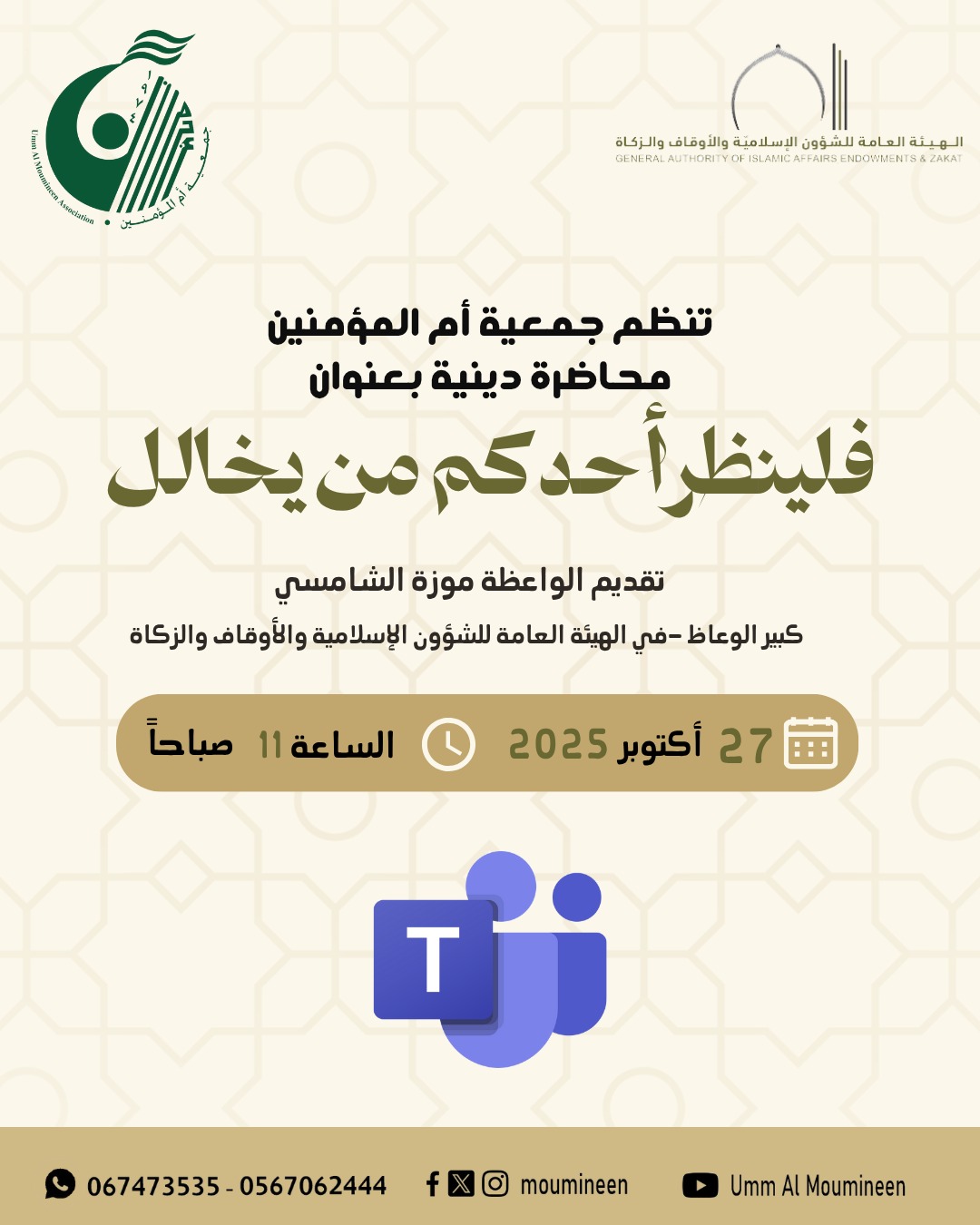 محاضرة " فلينظر أحدكم من يخالل " قدمتها الواعظة موزة الشامسي – من الهيئة العامة للشؤون الإسلامية والأوقاف والزكاة بعجمان بتاريخ 27 أكتوبر 2025عن بُعد...