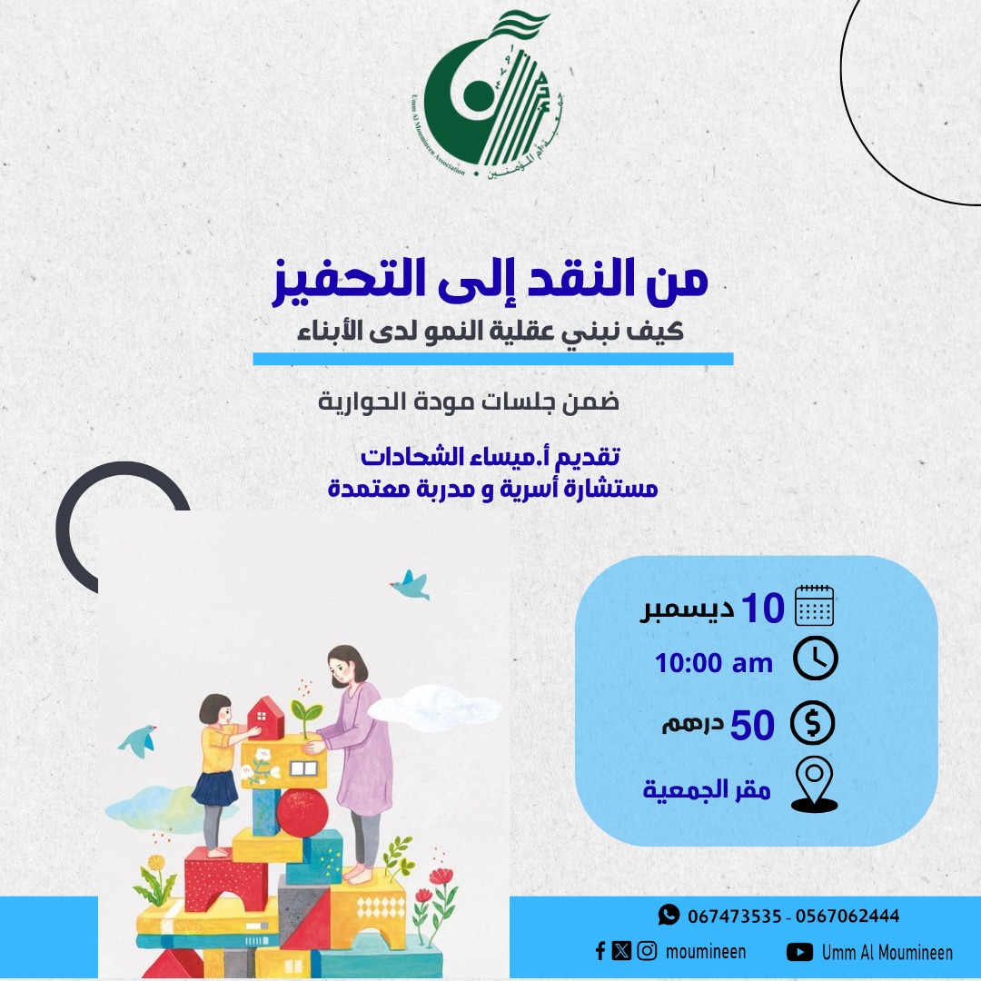 الجلسة الحوارية " من النقد الى التحفيز " كيف نبني عقلية النمو لدى الأبناء جلسة ضمن برنامج جلسات مودة الحوارية، قدمتها أ.ميساء الشحادات مستشارة أسرية ومدربة معتمدة في مقر الجمعية – عجمان بتاريخ 10 ديسمبر 2025....
