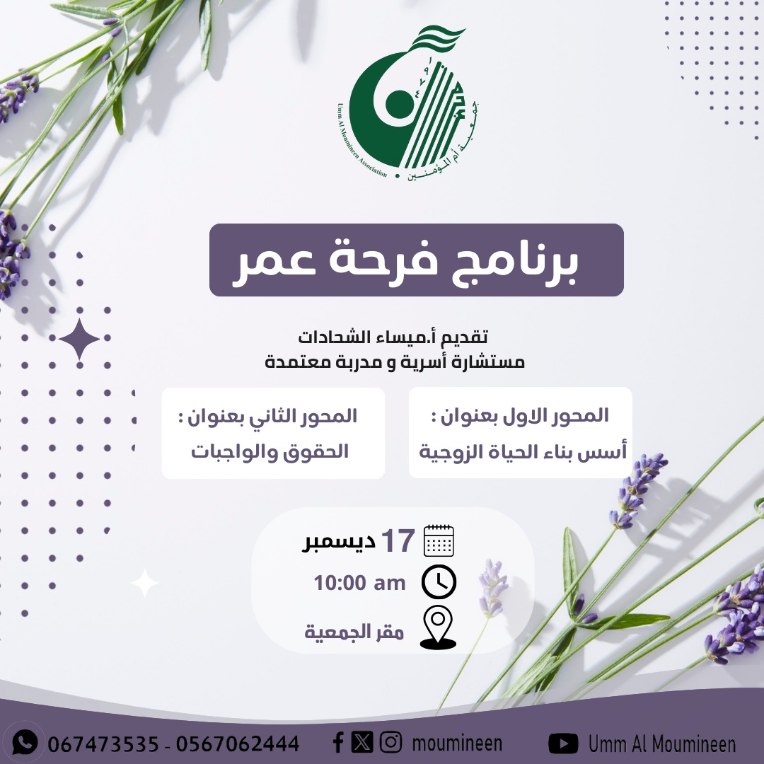 الجلسة الحوارية (برنامج فرحة عمر) جلسة ضمن برنامج جلسات مودة الحوارية، قدمتها أ.ميساء الشحادات مستشارة أسرية ومدربة معتمدة في مقر الجمعية – عجمان بتاريخ 17 ديسمبر2025....
