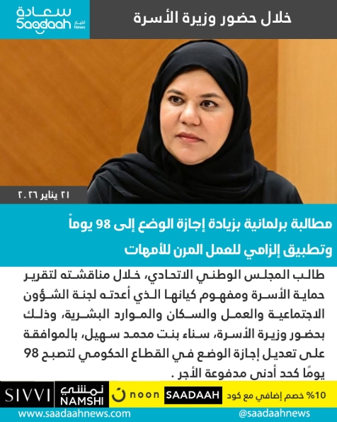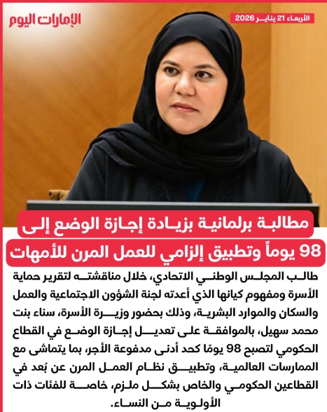 طالب المجلس الوطني الاتحادي، خلال مناقشته لتقرير حماية الأسرة ومفهوم كيانها الذي أعدته لجنة الشؤون الاجتماعية والعمل والسكان والموارد البشرية، وذلك بحضور وزيرة الأسرة، سناء بنت محمد سهيل، بالموافقة على تعديل إجازة الوضع في القطاع الحكومي لتصبح 98 يومًا كحد أدنى مدفوعة الأجر، بما يتماشى مع الممارسات العالمية، وتطبيق نظام العمل المرن عن بُعد في القطا...