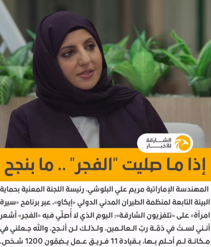 إذا ما صليت "الفجر" ما بنجح .. كلمات جميلة من المهندسة الإماراتية مريم علي البلوشي، رئيسة اللجنة المعنية بحماية البيئة، التابعة لمنظمة الطيران المدني الدولي "إيكاو"....