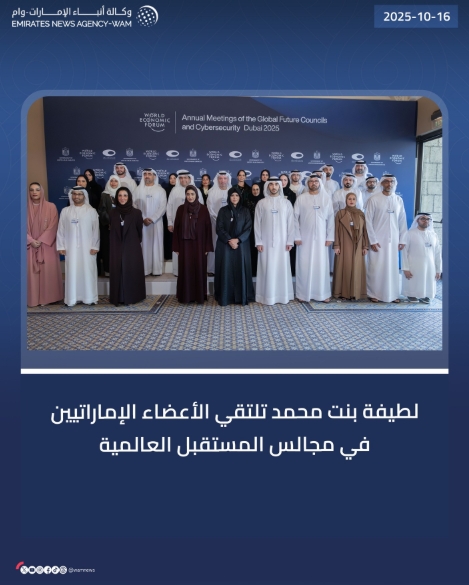 التقت سموّ الشيخة لطيفة بنت محمد بن راشد آل مكتوم، رئيسة هيئة الثقافة والفنون في دبي، بحضور سموّ الشيخ محمد بن راشد بن محمد بن راشد آل مكتوم، أعضاء مجالس المستقبل العالمية الإماراتيين الذين يمثلون نخبة من الكفاءات الوطنية، ضمن أعمال مجالس المستقبل العالمية والأمن السيبراني 2025، الذي نظمته حكومة الإمارات بالتعاون مع المنتدى الاقتصادي العالمي...