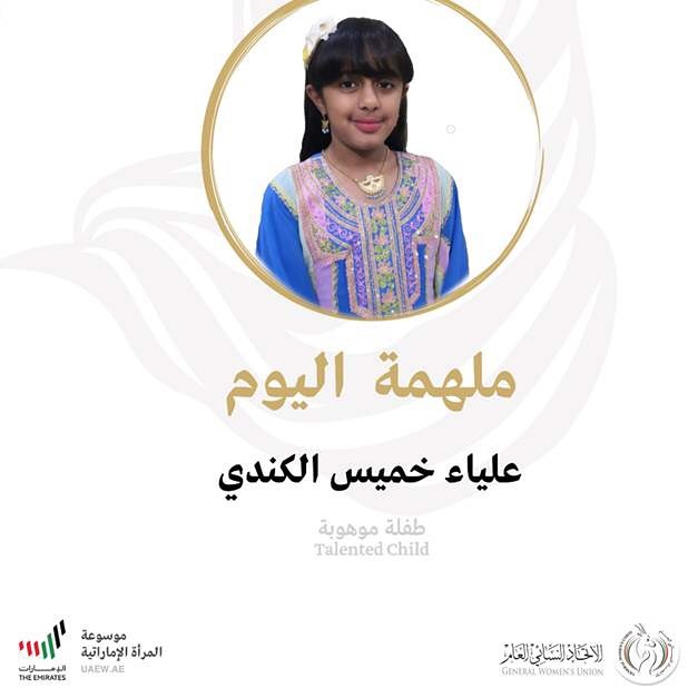 بطموح وروح الطفولة تسمو التطلعات والأحلام وتتحقق بالجد والإصرار والمثابرة طفولة واعدة بمستقبل مشرق ملهمتنا عضوة في مجلس الطفل التابع لجمعية الفجيرة الاجتماعية الثقافية، وعضوة في فريق ملهمون التابع لجمعية عجمان الاجتماعية، حاصلة على عدة جوائز تربوية تقديراً لتميزها منها جائزة الشارقة للتميز والتفوق التربوي،، وجائزة التحبير للقرآن الكريم،، وجائزة الو...