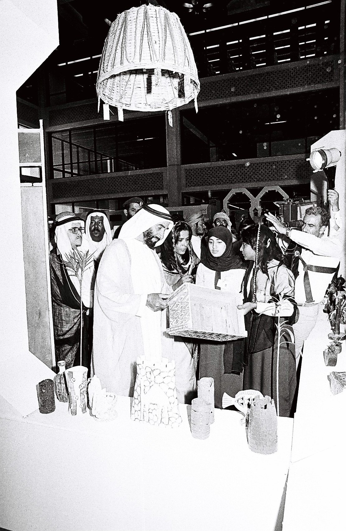 صاحب السمو الشيخ زايد يطلع على منتجات واعمال الطالبات في احد المعارض...