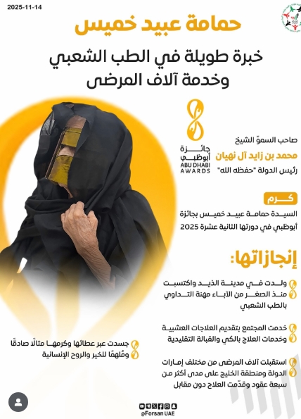 خدمت المجتمع بتقديم العلاجات العشبية وخدمات العلاج بالكي والقبالة التقليدية، وجسدت عبر عطائها وكرمها مثالاً صادقًا وملهما للخير والروح الإنسانية.. حمامة عبيد خميس المكرّمة بـ #جائزة_أبوظبي.. خبرة طويلة في الطب الشعبي وخدمة آلاف المرضى...