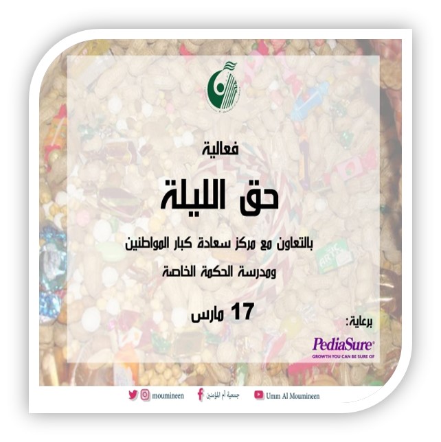فعالية حق الليلة بالتعاون مع مركز سعادة كبار المواطنين ومدرسة الحكمة الخاصة، والهلال الأحمر الإماراتي، وشركة بيدياشور، قدم الحفل الاعلامي محمد عمران، حضورياً في مقر الجمعية....