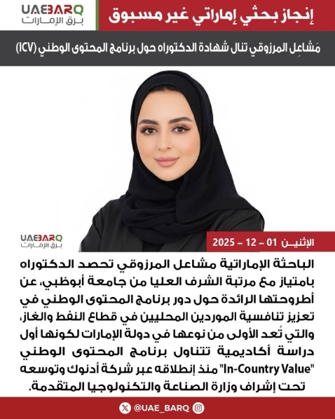 الباحثة الإماراتية مشاعل المرزوقي تحصد الدكتوراه بامتياز مع مرتبة الشرف العليا من جامعة أبوظبي، عن أطروحتها الرائدة حول دور برنامج المحتوى الوطني في تعزيز تنافسية الموردين المحليين في قطاع النفط والغاز، والتي تُعد الأولى من نوعها في دولة الإمارات لكونها أول دراسة أكاديمية تتناول برنامج المحتوى الوطني "In-Country Value" منذ إنطلاقه عبر شركة أدنوك وت...