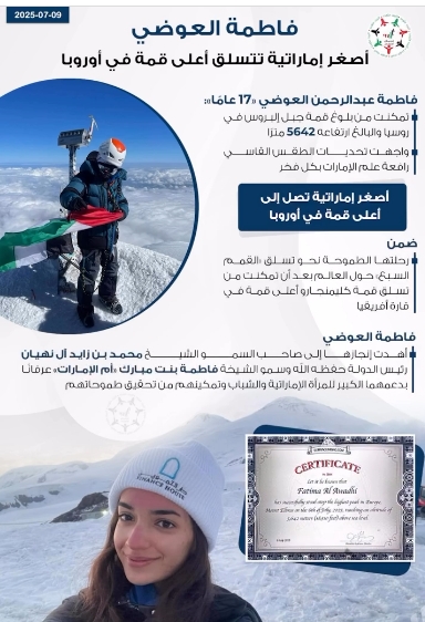 إنجاز جديد يُضاف إلى سجل الإمارات المشرّف.. فاطمة_عبدالرحمن_العوضي، البالغة من العمر 17 عامًا، تتمكن من بلوغ قمة جبل إلبروس في روسيا...