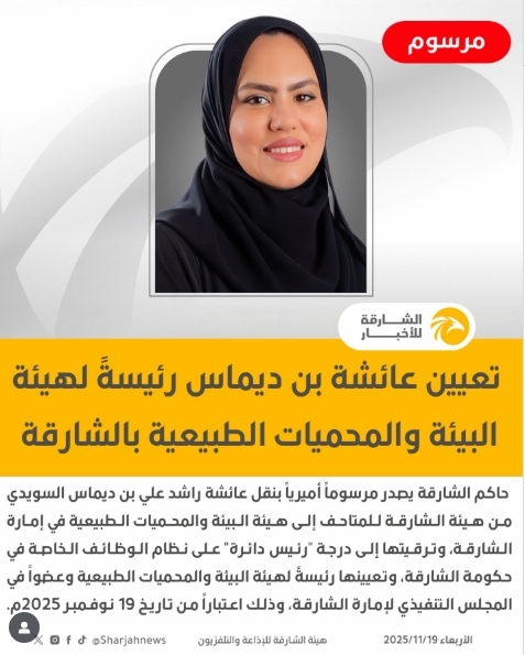 تعيين عائشة بن ديماس رئيسةً لهيئة البيئة والمحميات الطبيعية بالشارقة...