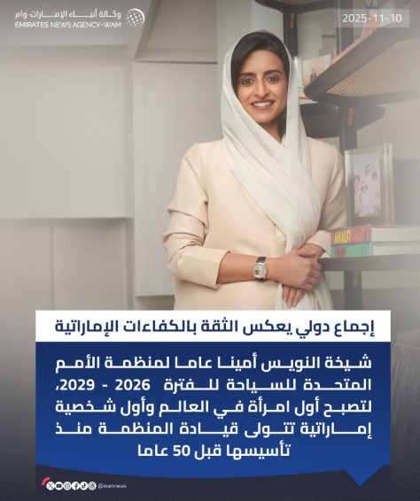 اختارت منظمة الأمم المتحدة للسياحة بأغلبية أكثر من 160 دولة، سعادة شيخة ناصر النويس أميناً عاماً للمنظمة للفترة من عام 2026 إلى عام 2029 وذلك بعد انتخابها في مايو الماضي من قبل مجلسها التنفيذي لتولي المنصب، بعدما استكملت سعادتها بنجاح غير مسبوق جميع خطوات الترشح والانتخاب والفوز وفقاً لبروتوكول المنظمة....