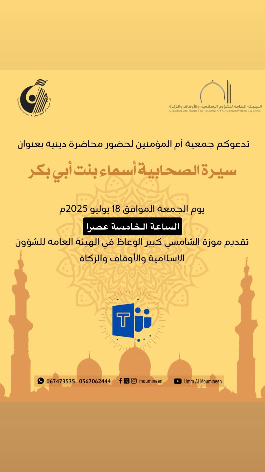محاضرة " سيرة الصحابية أسماء بنت أبي بكر" قدمتها كبير الوعاظ أ.موزة الشامسي– من الهيئة العامة للشؤون الإسلامية والأوقاف والزكاة بعجمان بتاريخ 18/7/2025 عن بُعد....