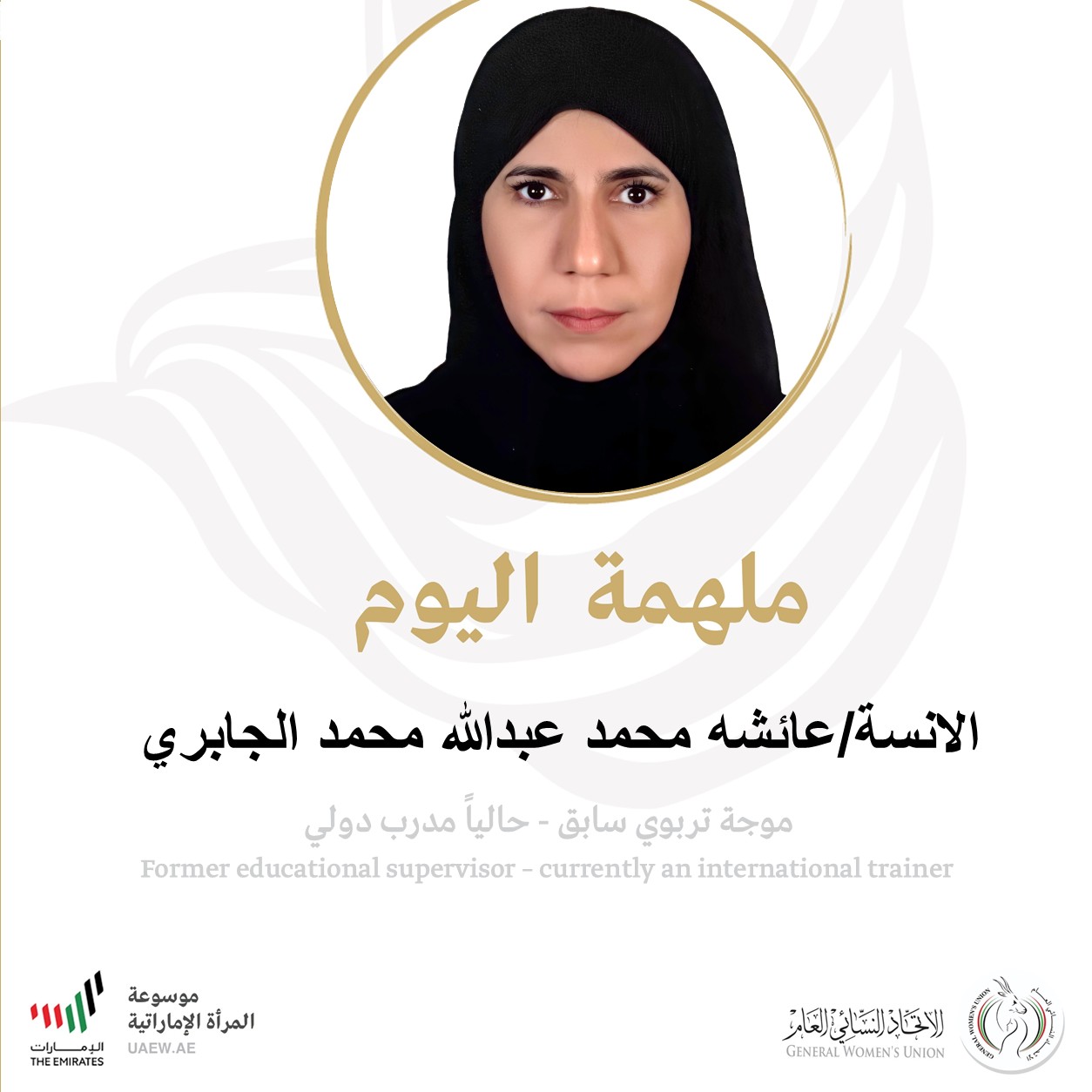 الأستاذة عائشة محمد عبدالله الجابري مدربة دولية معتمدة ومحاضِرة متخصصة في مجالات السعادة والإيجابية والتنمية البشرية...