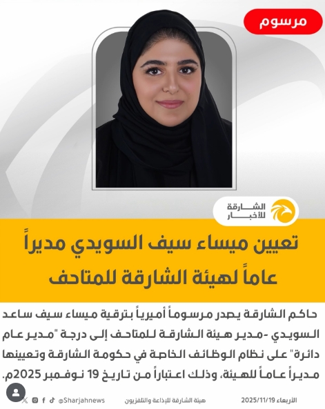 تعيين ميساء سيف السويدي مديراً عاماً لهيئة الشارقة للمتاحف...
