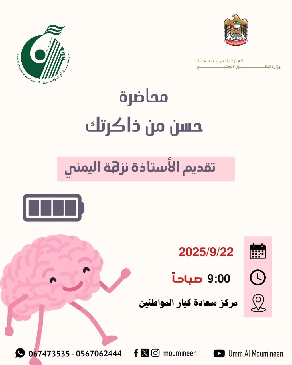 محاضرة " حسن من ذاكرتك " قدمتها أ.نزهة اليمني - مدربة معتمدة ، لكبار المواطنين بتاريخ 22 سبتمبر 2025 بمقر مركز سعادة كبار المواطنين بعجمان....