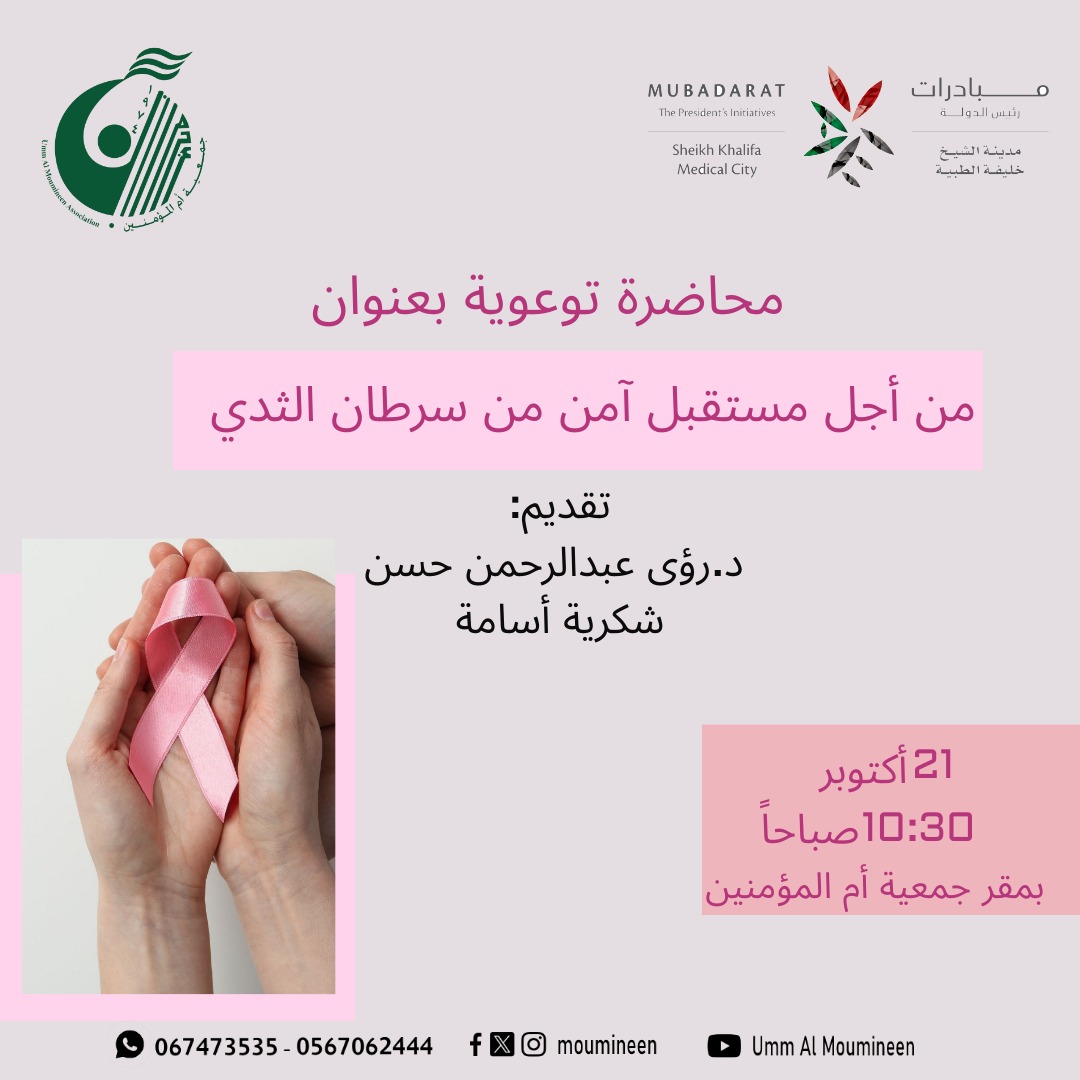 محاضرة توعوية " من أجل مستقبل آمن من سرطان الثدي" قدمتها د.رؤى عبدالرحمن حسن وأ.شكرية أسامة بتاريخ 21 أكتوبر2025 بمناسبة أكتوبر الوردي بمقر الجمعية....