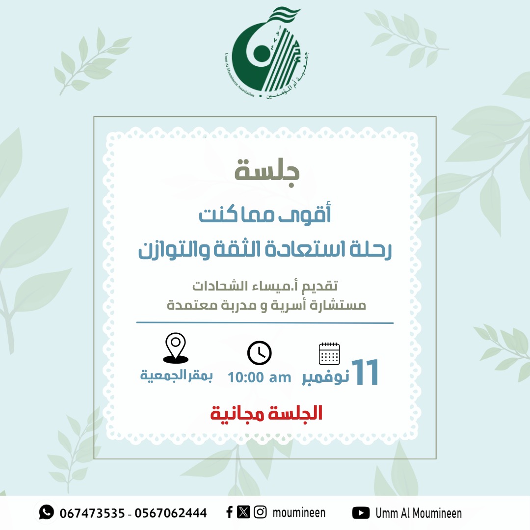 الجلسة الحوارية " العادات تصنع المعجزات" جلسة ضمن برنامج جلسات مودة الحوارية، قدمتها أ.ميساء الشحادات مستشارة أسرية ومدربة معتمدة في أيدين كافية – عجمان بتاريخ 9 يوليو2025م...