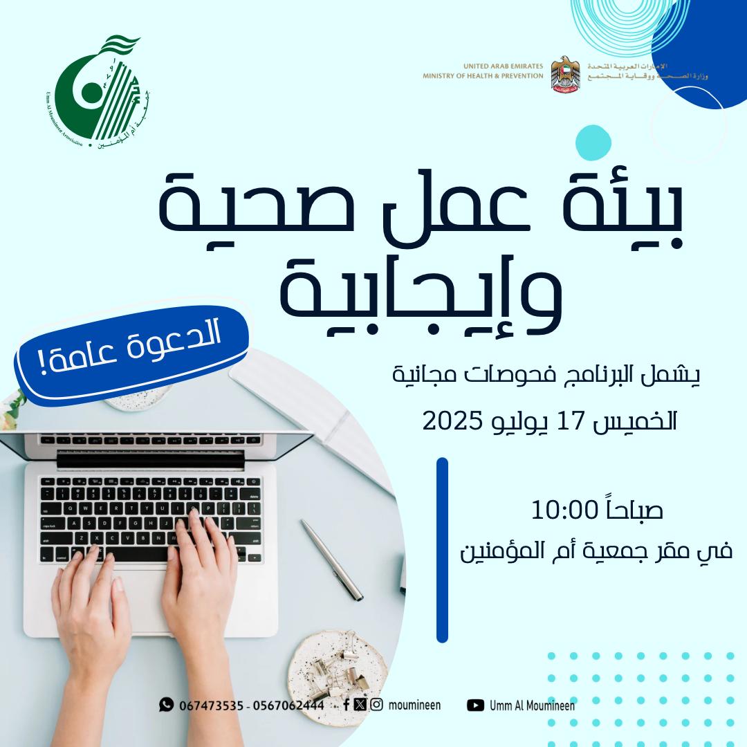 برنامج " بيئة عمل صحية وإيجابية" نظمت الجمعية البرنامج بالتعاون مع المكتب التمثيلي لوزارة الصحة ووقاية المجتمع بعجمان والذي تضمن : فحوصات طبية – استشارات طبية مجانية وذلك بهدف التوعية بأنماط الحياة الصحية في بيئة العمل بتاريخ 17/7/2025 بمقر الجمعية...